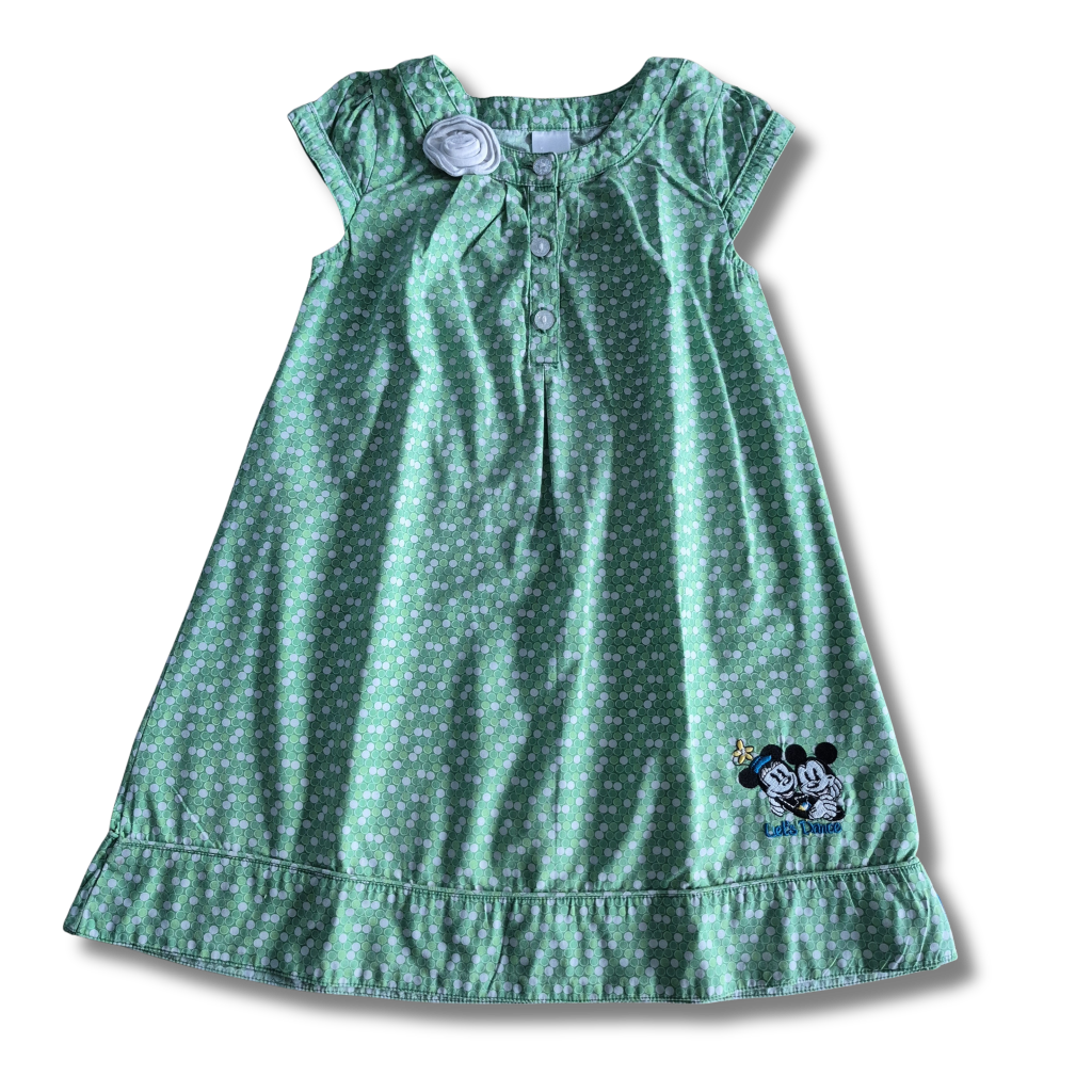 Groene bolletjes kleed met Minnie en Mickey Mouse 'Let's Dance'.