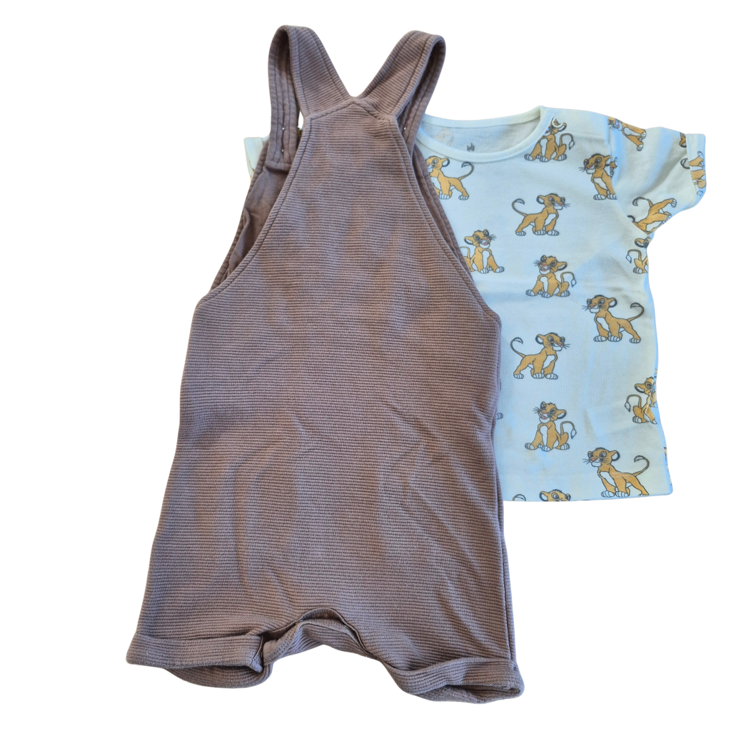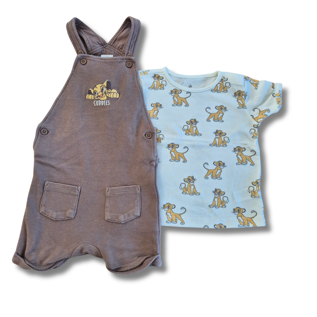 Het setje bestaat uit een korte bruine salopet en een witte t-shirt met Simba op.