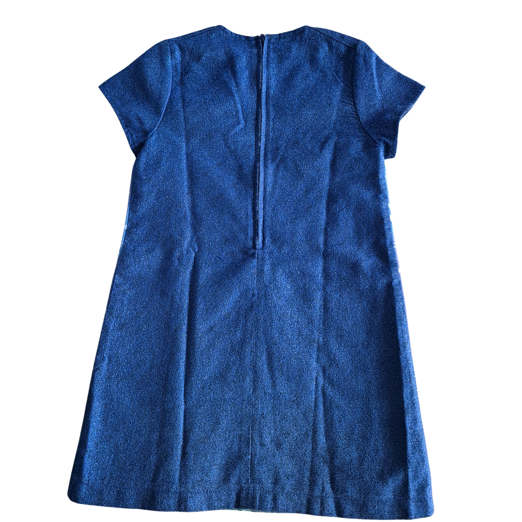 Donker blauwe gevoerde jurk met print van beer en meisje.