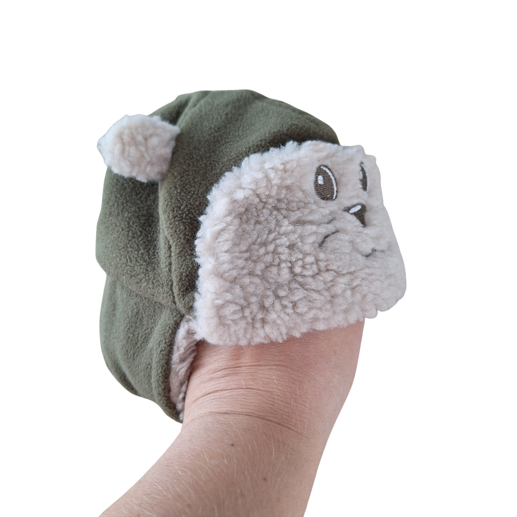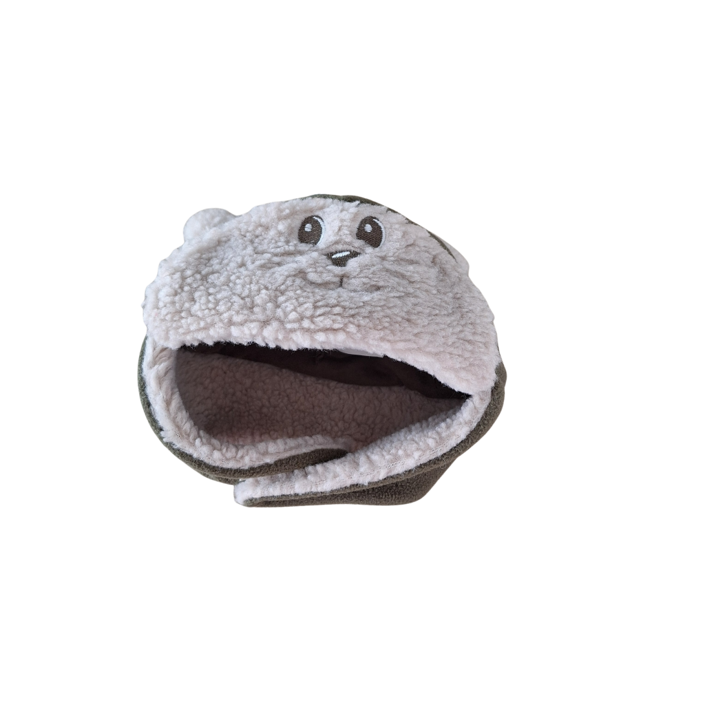 Warme berenmutsje, in beige en kakigroen, Kan met velcro gesloten worden.