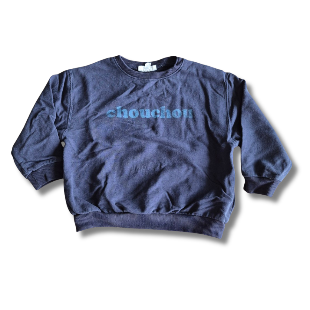 Donker blauwe trui met drukknopen op de schouder en tekst vooraan: "Chouchou"