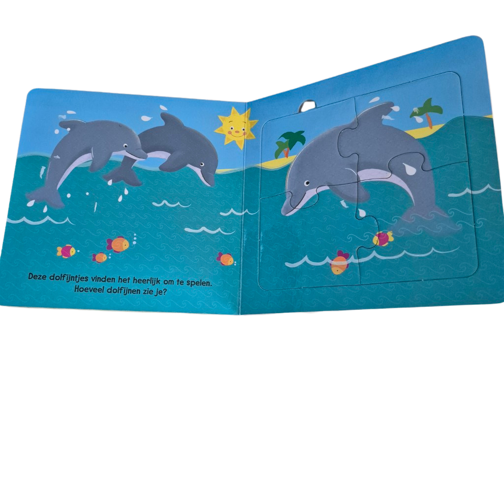 Ontdek allerlei zeedieren in dit leuke puzzelboek! Hoeveel dolfijnen spelen in het water? En hoeveel zeesterren tel jij op de zeebodem? Kijk goed naar de tekeningen en leg alle puzzelstukken op de juiste plaats.