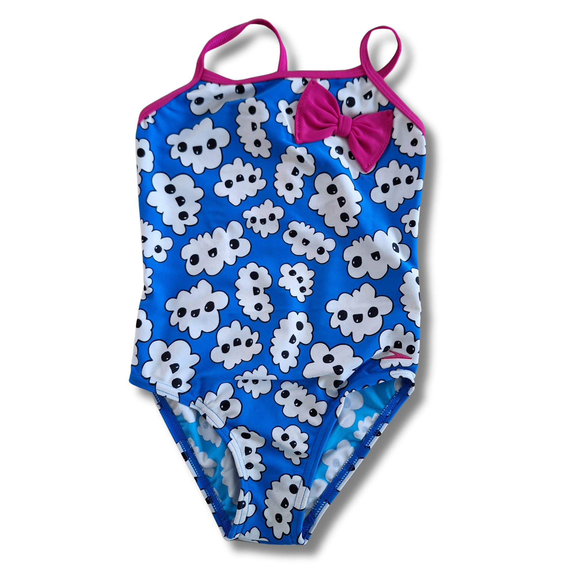 Badpak, blauw met wolkengezichtjes, roos strikje en roze spaghettibandjes.