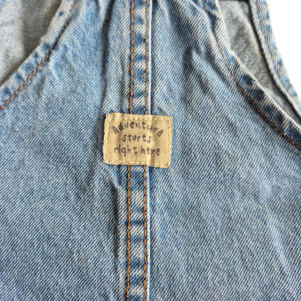 Blauwe jeans salopette, kan aan de onderkant open met drukknopen.