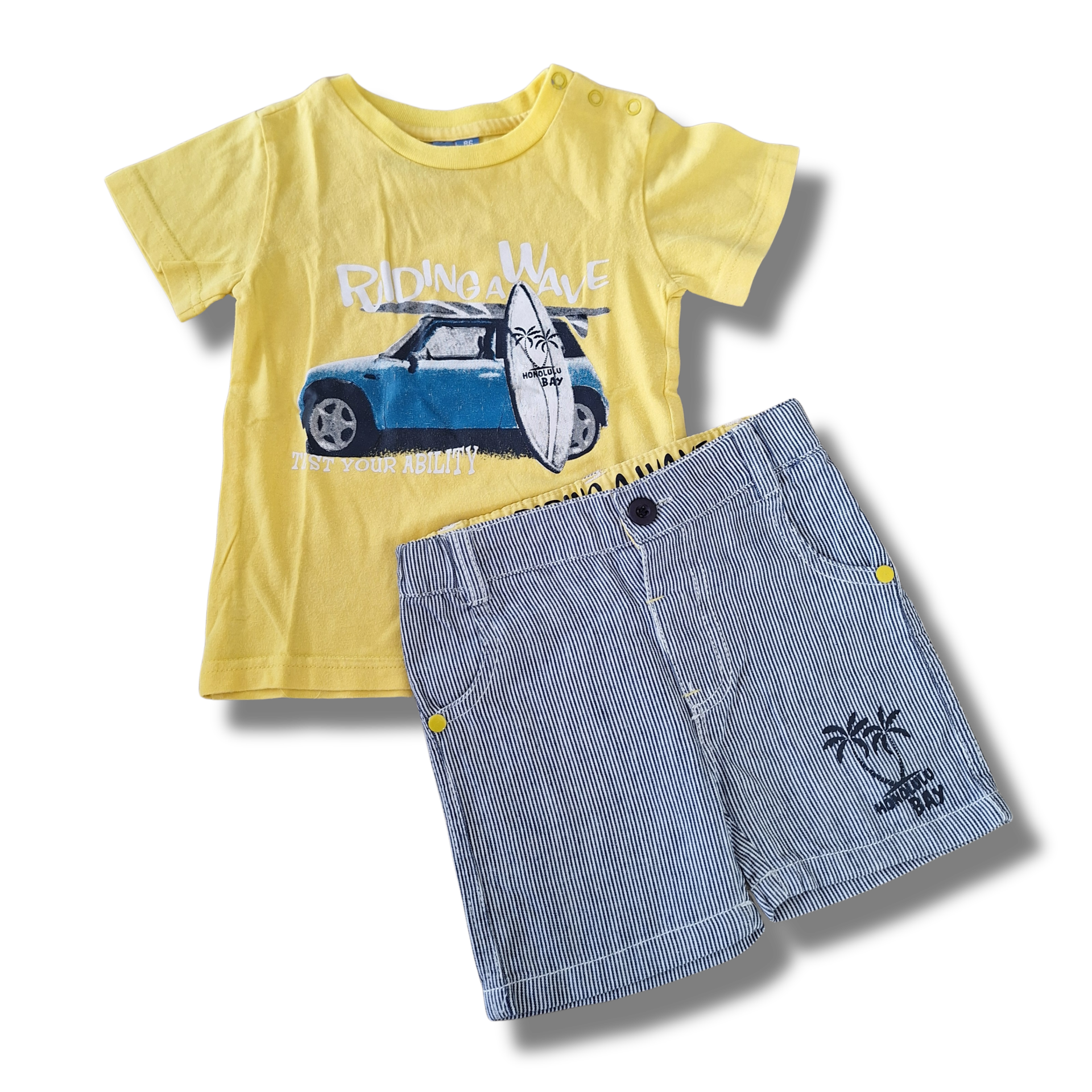 Setje bestaat uit een t-shirt en een gestreepte short.