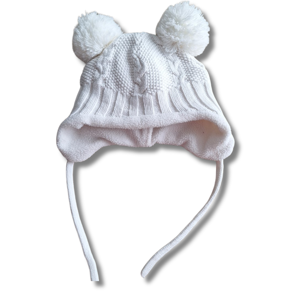 Wit mutsje met koortjes om te strikken onder de kin.