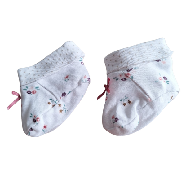 Slofjes, wit met bloemetjes en stipjes.