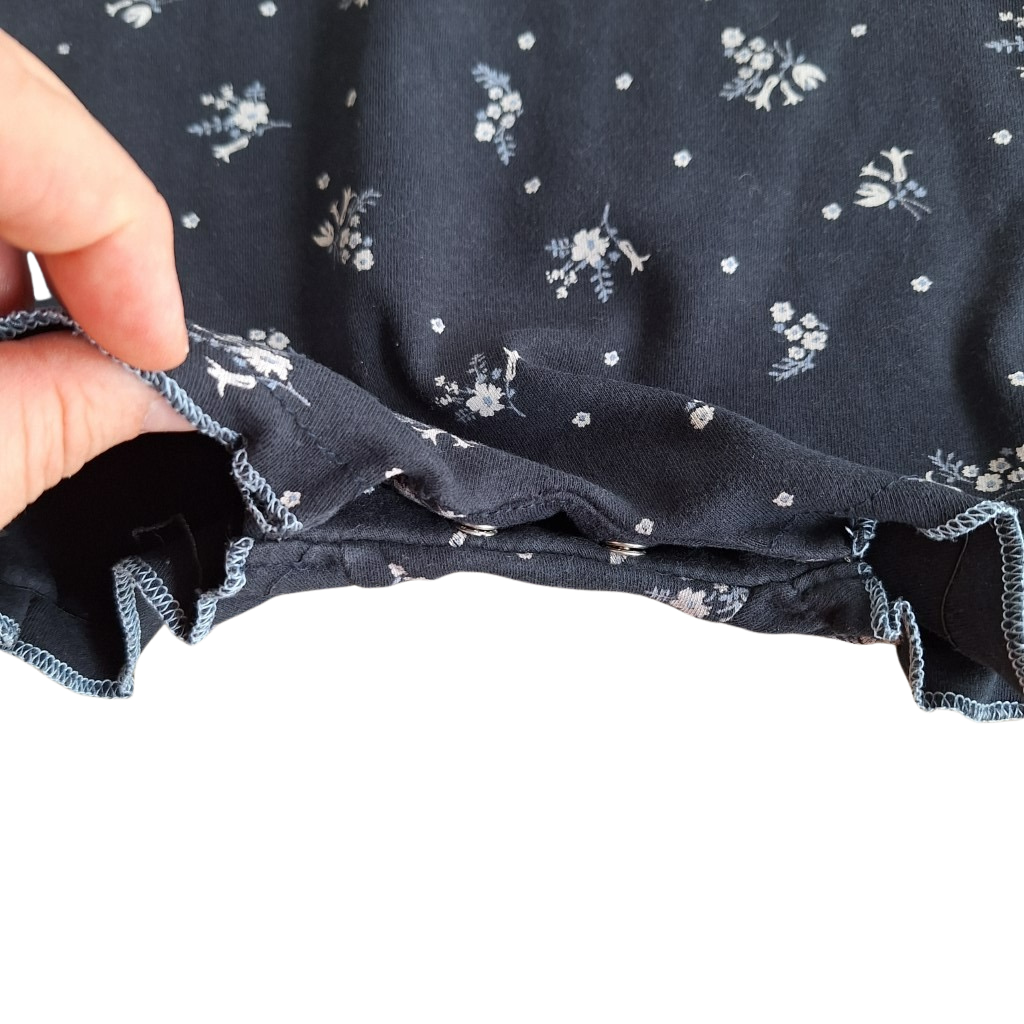 Donkerblauw boxpakje met bloemetjes.