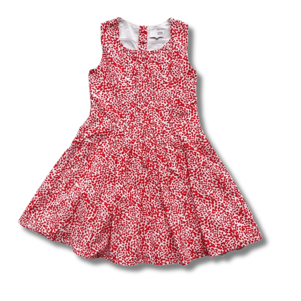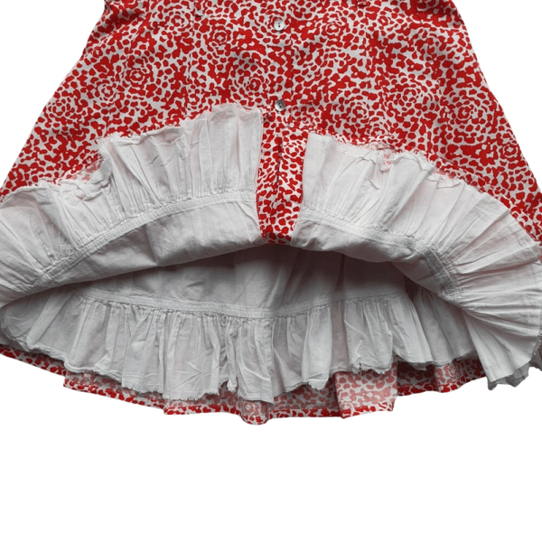 Wit met rode jurk. Achteraan is de sluiting met knoopjes. De jurk is gevoerd. Er is geen riempje bij de jurk.