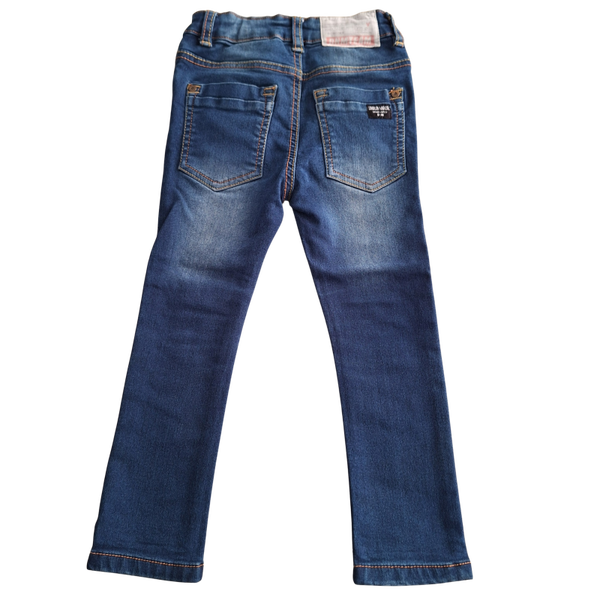 Blauwe jeansbroek, aanpasbaar binnenin.