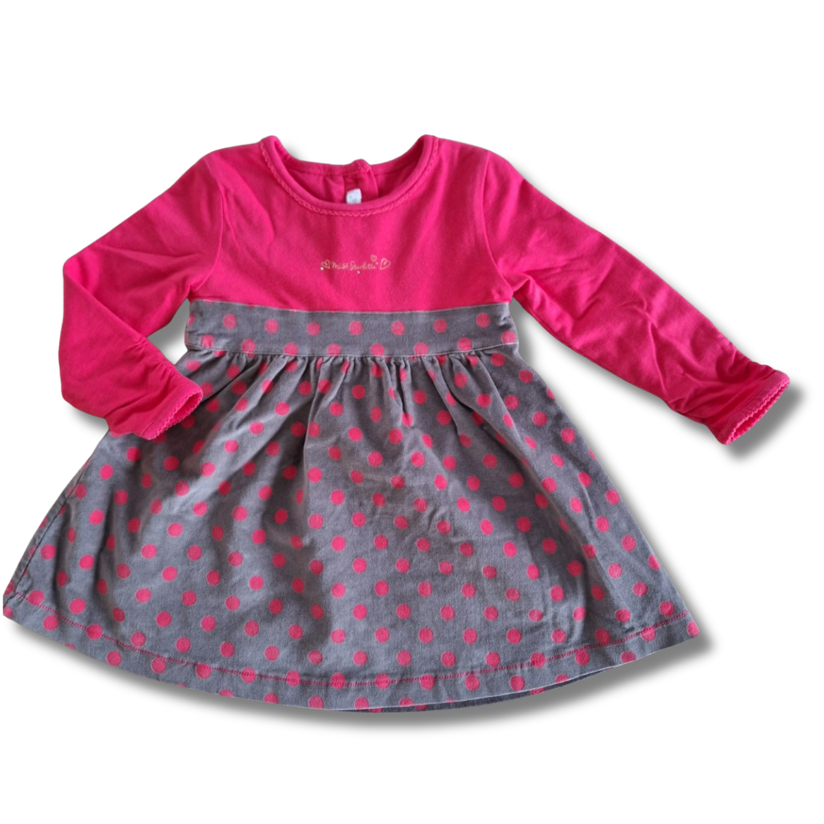Jurkje met lange mouwen, kleur roos en grijs. Het grijze stuk is in velours. Achteraan zijn er koopjes aan de rug.