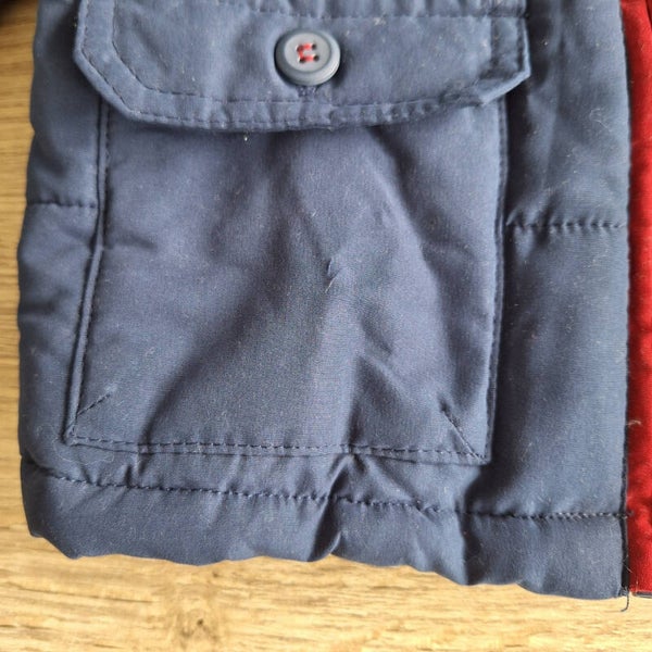 Vooraan is er een licht vlekje (zie detail foto) en op een zakje staan enkele krasjes.