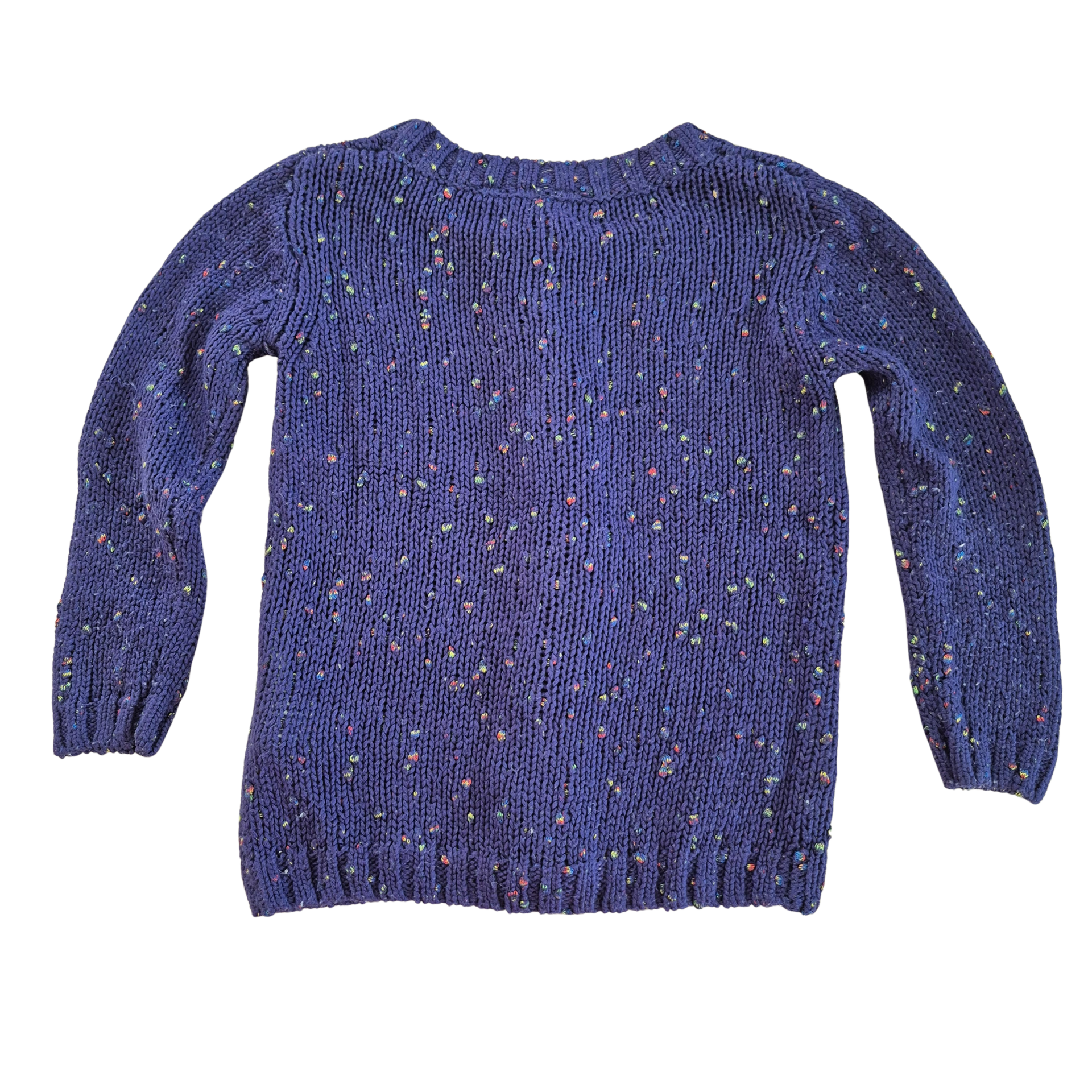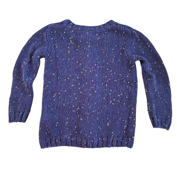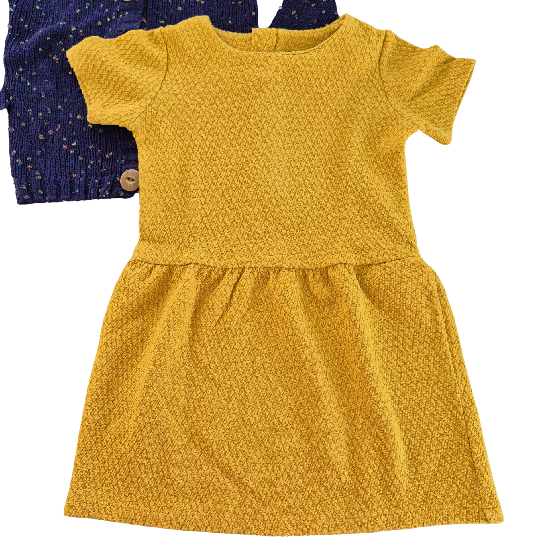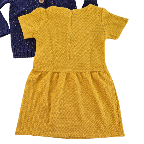 Blauwe gilet met spikkeltjes en knopen. Oker kleurig jurkje met achteraan een rits.