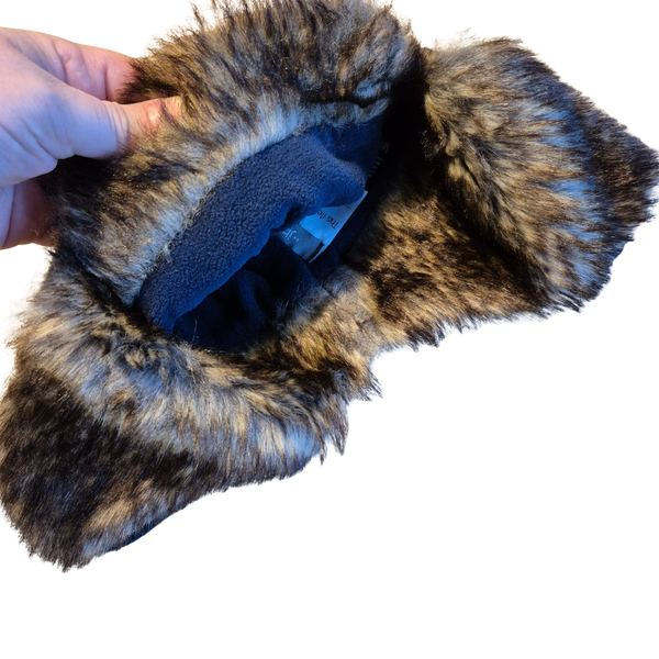 Beschrijving: Gebreide muts, binnenin fleece en namaak bond